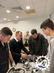 Далее для студентов была организована практическая часть под руководством локального тренера Васильева Александра. Ребята с большим интересом снимали, разбирали, собирали и устанавливали узлы и детали системы охлаждения двигателя; системы смазки двигателя; топливной системы двигателя; бесступенчатой коробки передач; системы полного привода двигателя.