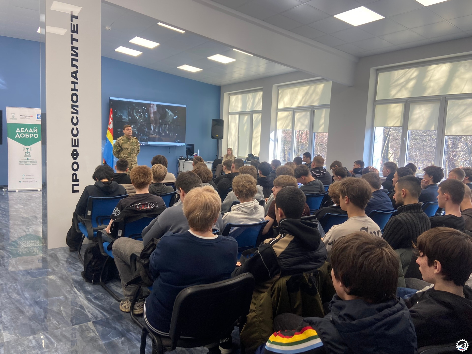 Также, студентам показали короткометражный фильм и рассказали о возможностях молодежной политики. Познакомили с крупными Всероссийскими платформами (платформа добрых дел dobro.ru/, академия развития гражданского общества «Добрино» экосистемы Добро.рф edu.dobro.ru/, ФГАИС «Молодёжь России - возможности молодёжной политики myrosmol.ru/, всероссийская образовательная платформа «Академия Росмолодёжи» academy.myrosmol.ru/, просветительская платформа «Российское общество «Знание» znanierussia.ru/), вдохновили на участие в добровольческой деятельности от первых волонтерских часов, заработанных на платформе Добро.рф, до грантовых конкурсов для физических лиц, а также рассказали, как превратить социально значимую идею в реальный проект с финансовой поддержкой. Сегодня благодаря программам молодежной политики каждый студент может заявить о себе, получить опыт в управлении, творчестве, бизнесе и внести свой собственный вклад в развитие своего города и страны.