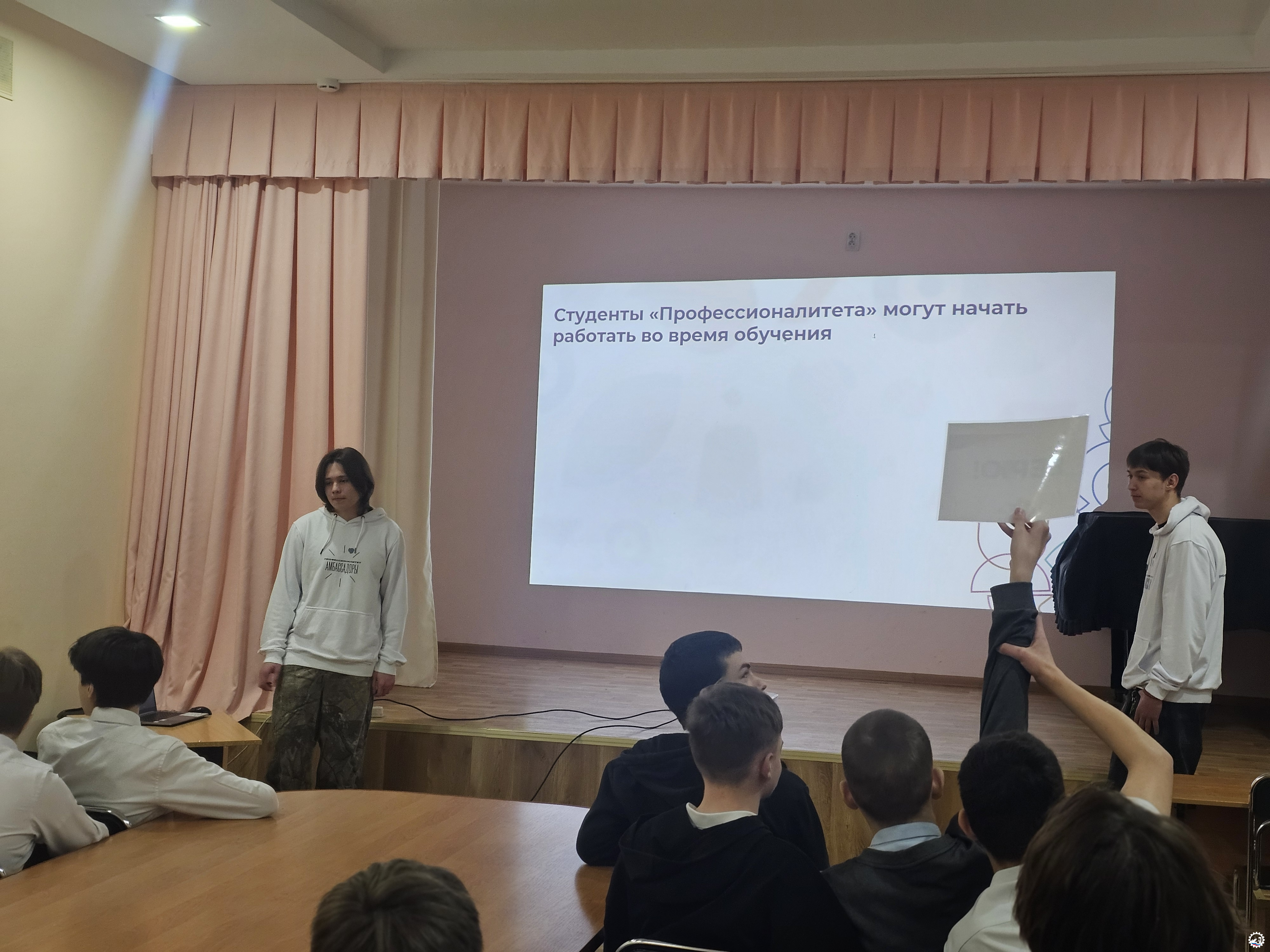 Встреча, организованная в преддверии Единого дня открытых дверей проекта, прошла в информационно‑игровом формате. В ходе мероприятия, учащиеся приняли участие в интеллектуальной игре «Верю‑не верю», где им предстояло определить, какие утверждения о проекте «Профессионалитет» являются правдой, а какие — мифом. Среди обсуждаемых тезисов были такие вопросы, как сокращённая продолжительность обучения, возможность получения практической подготовки непосредственно на предприятиях и гарантированное трудоустройство после выпуска.