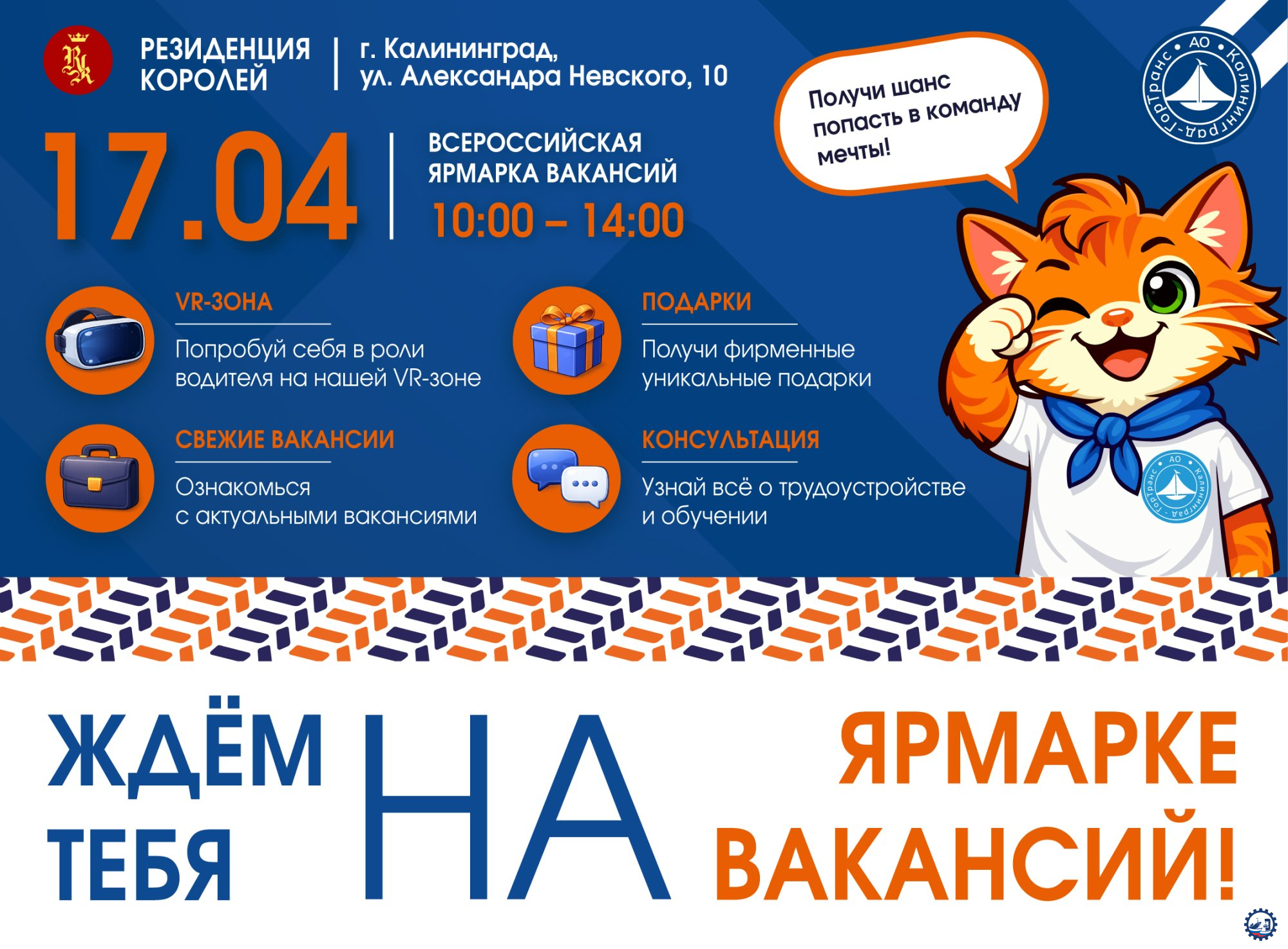 Какие работодатели будут на ярмарке? Среди участников — ведущие предприятия региона, заинтересованные в молодых кадрах: ПСЗ «Янтарь»; «Автотор»; РЖД; «Калининград‑Гортранс»; «Агроторг»; «Первый хлебозавод»; и многие другие. «Ярмарка трудоустройства — это прямой мост между студентами и работодателями. Мы видим большой запрос на молодых специалистов, и наша задача — помочь им сделать первый шаг в карьере», — отметил представитель Кадрового центра Калининградской области. Не упустите шанс начать карьеру в любимой сфере! Приходите 17 апреля в «Резиденцию королей» — найдите стажировку, подработку или первую полноценную работу, получите полезные знания и зарядитесь вдохновением для профессионального роста.