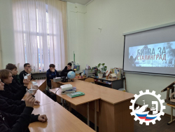 2 февраля 1943 года состоялась Сталинградская битва — одно из самых крупных и решающих событий в Великой Отечественной войне. 200 дней стойкости и мужества. Великая победа советского народа. Разговор об этом величайшем событии состоялся на тематическом занятии «Время для памяти». Студенты группы СП 13-09н вместе с преподавателем географии Лебедь Т. В. прониклись тем, какой ценой досталась эта победа, когда бой шёл за каждый дом и каждую улицу.